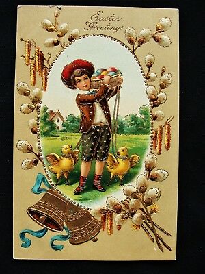 Girl wBasket Color Easter Eggs & Chicks On Leashes Fantasy Gold Hilites Postcard