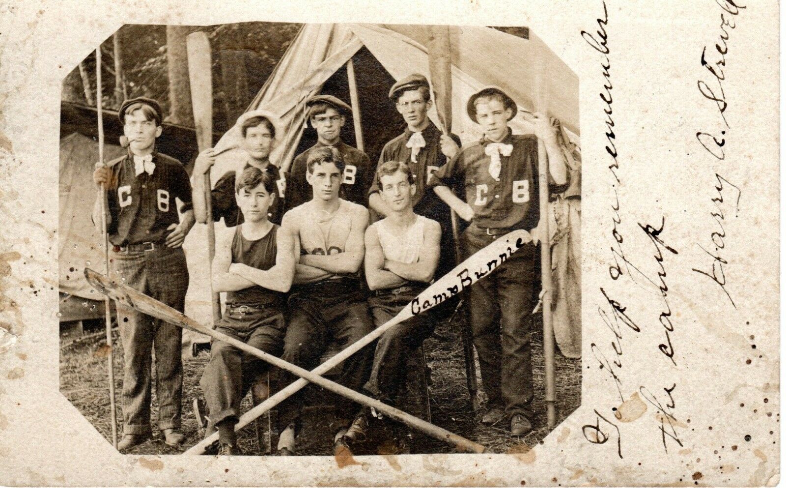 Title (ebay affiliate link): 1906 CAMP BUNNIE NY? - RPPC - Group of Rowing Buddies Outside a Tent Real Photo