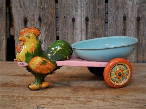Title (ebay affiliate link): Vintage Old Tin Easter Toy Rooster Pulling Egg Card AAFA