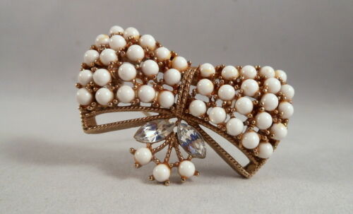 Title (ebay affiliate link): Vintage CAPRI White Milk Glass Bow Clear Marquis Rhinestone Gold Tone Brooch/Pin