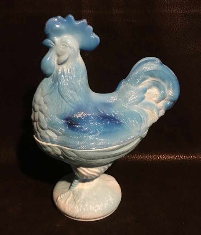 Title (ebay affiliate link): Heisey Mark Blue Slag Milk Glass Standing Rooster Covered Candy Dish Compote
