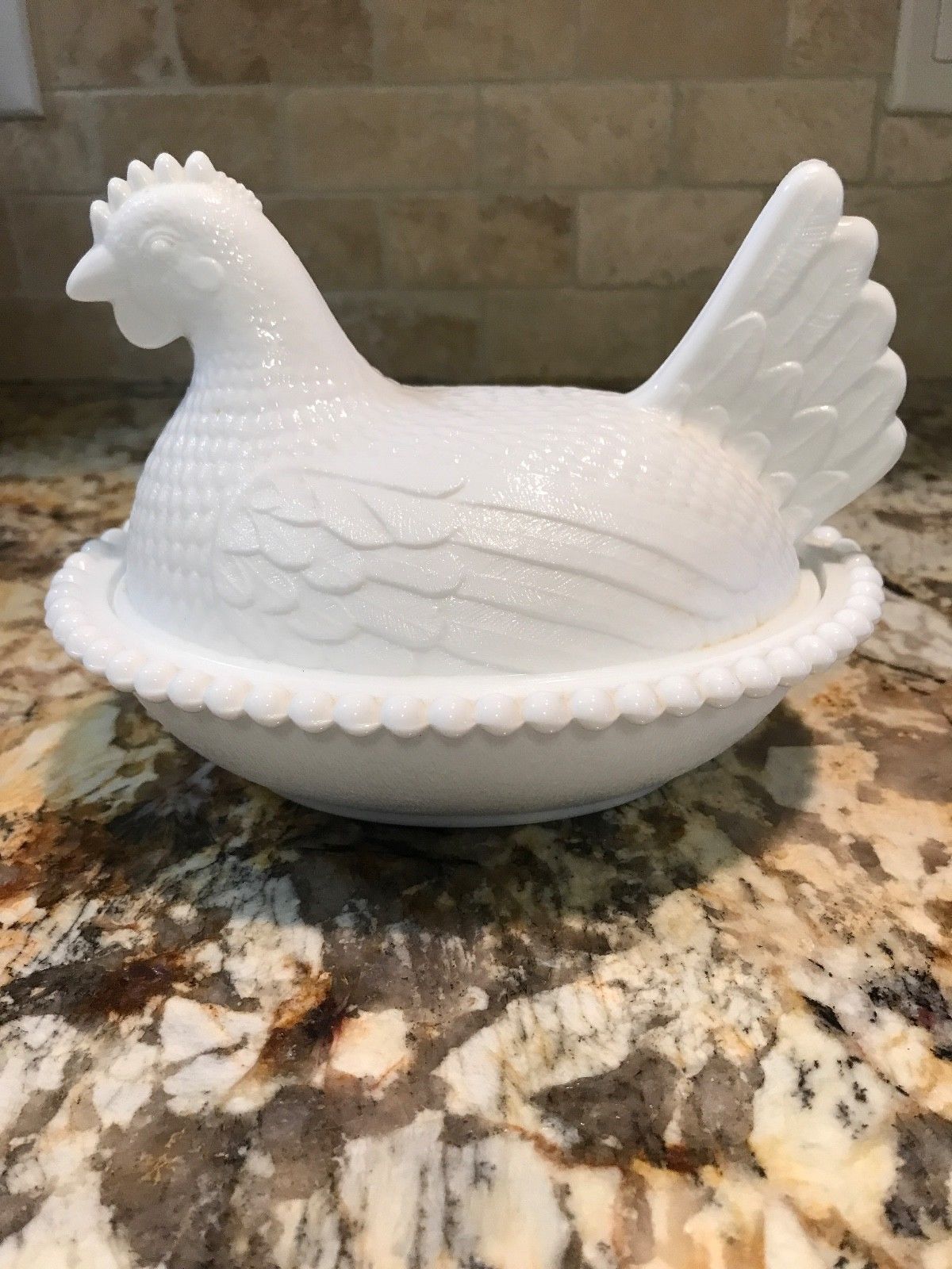Title (ebay affiliate link): Vintage White Milk Glass Hen Chicken On Nest Basket Butter Candy Trinket Dish