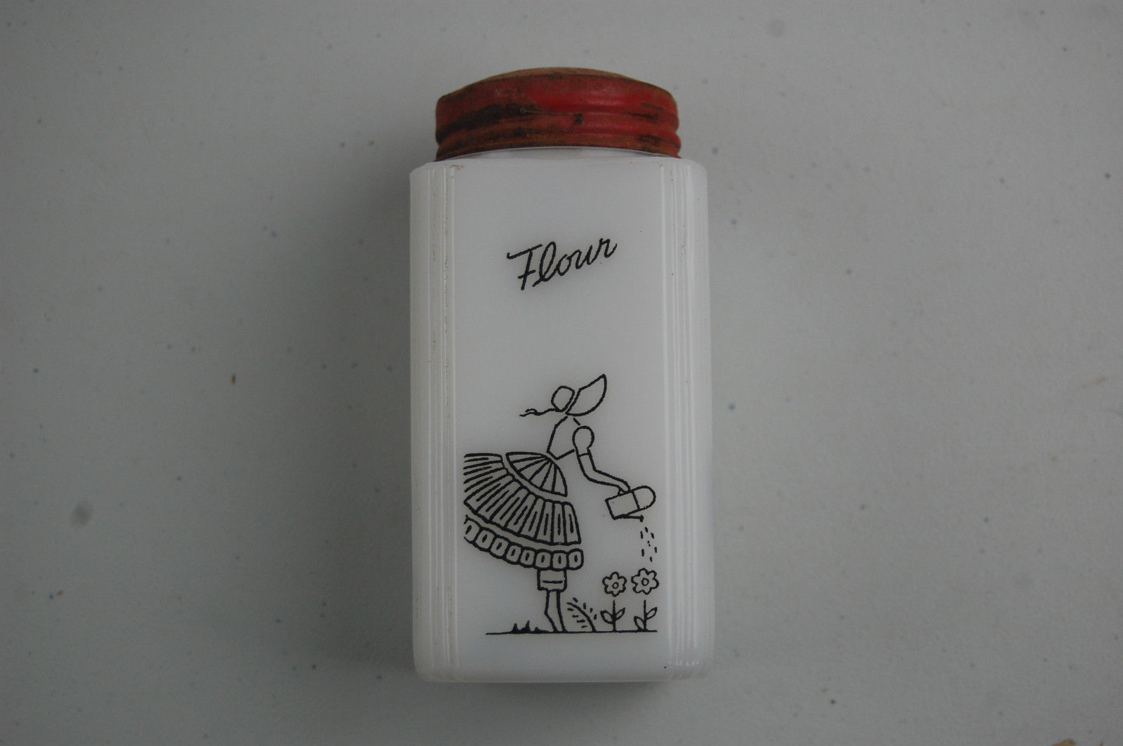 Vintage Hazel Atlas Mckee TIPP Milk Glass Garden Girl Lady Flour Shaker