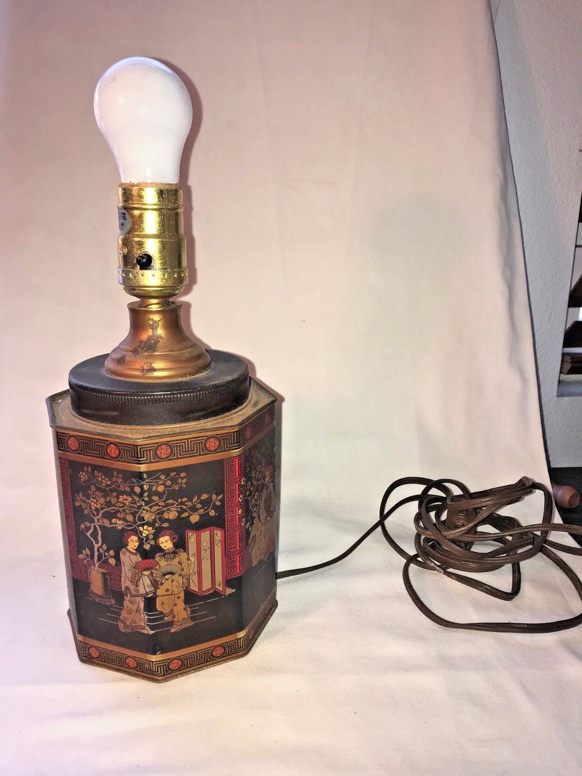 Title (ebay affiliate link): VINTAGE FREDERICK COOPER STYLE ASIAN CHINOISERIE TIN TEA CANISTER LAMP