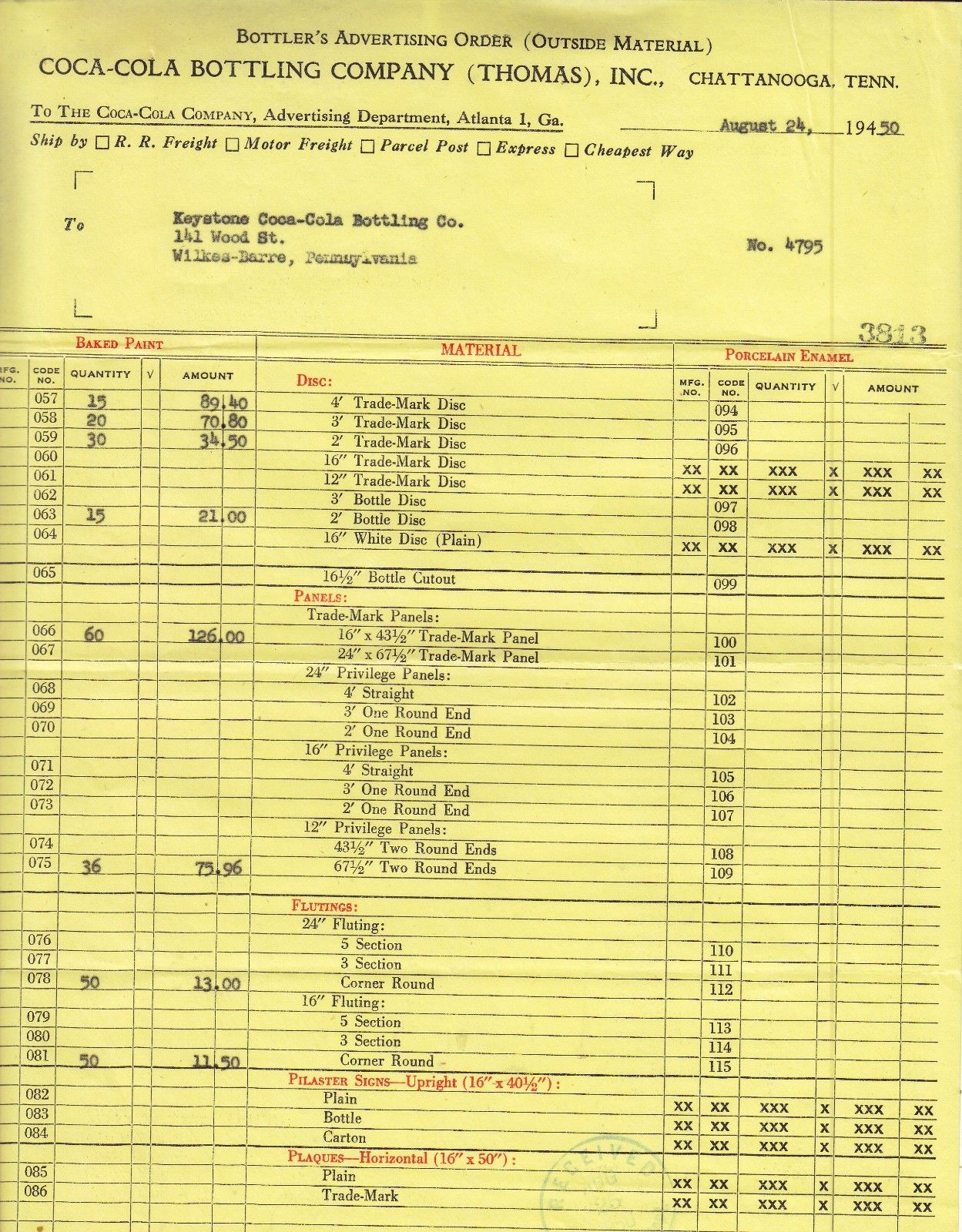 THE COCA-COLA BOTTLING CO.(THOMAS). inc. ADVERTISING ORDER DATED AUG. 24, 1950