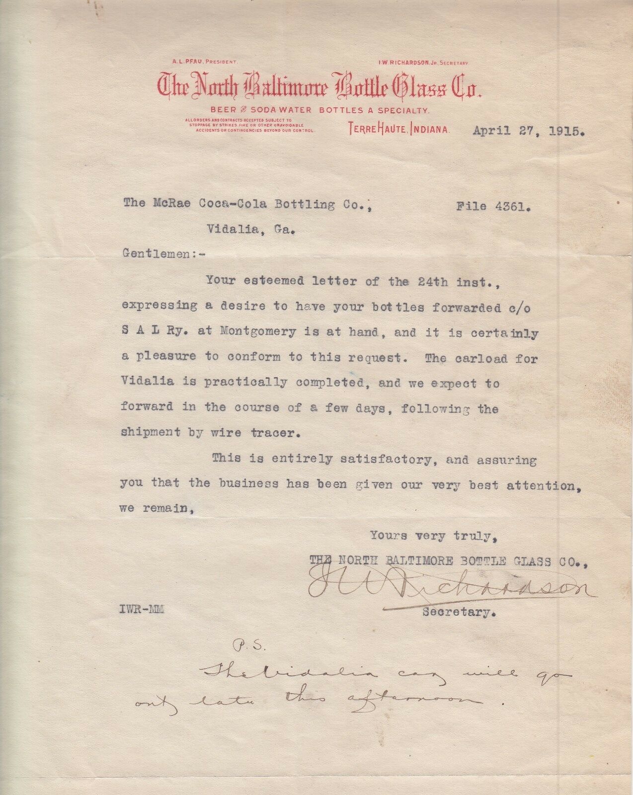 THE NORTH BALTIMORE BOTTLE GLASS CO. LETTERHEAD DATED APRIL 27, 1915 2 PAGES