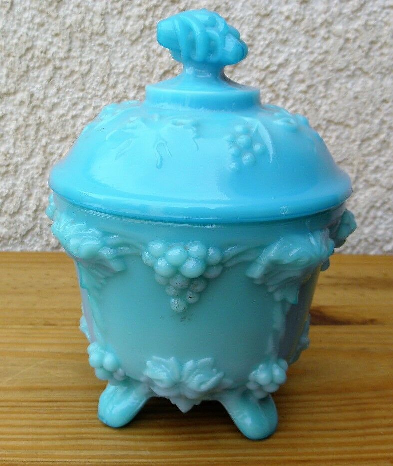 Title (ebay affiliate link): Vintage Blue Milk Glass Covered Candy Dish Jeanette Glass 1950''s Grape Pattern
