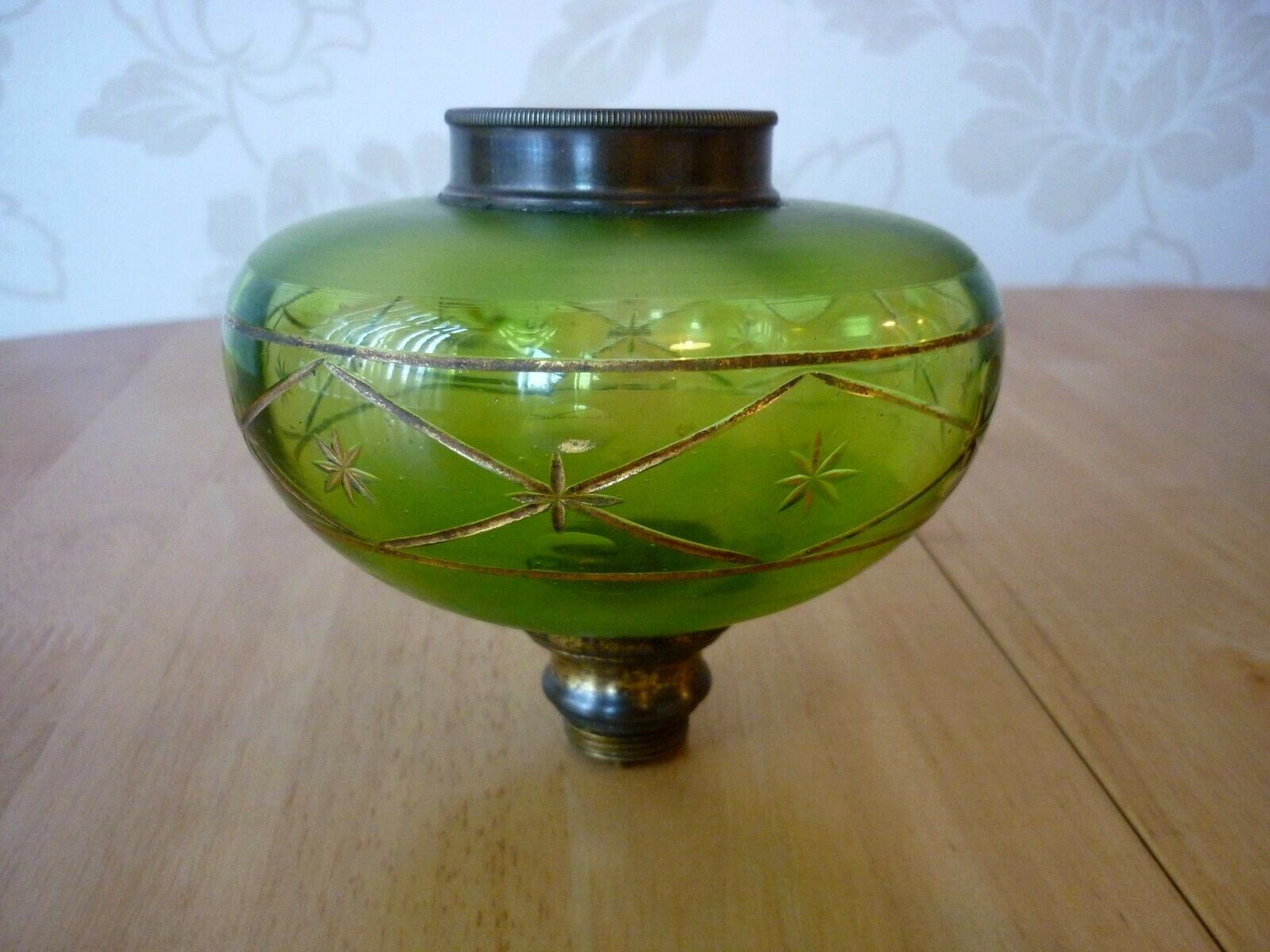 Title (ebay affiliate link): ANTIQUE CUT, ETCHED & GILT GREEN GLASS SMALL OIL LAMP FONT / RESERVOIR