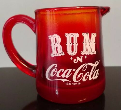 Title (ebay affiliate link): Vintage Ruby Red, RUM-N-Coca Cola Shot Glass. 2 Oz. Pitcher shaped with handle.