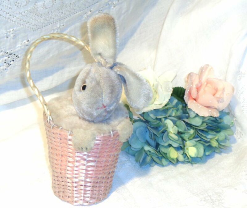 ABSOLUTELY ADORABLE OLD ANTIQUE MUSICAL AUTOMATON MOHAIR RABBIT IN A BASKET