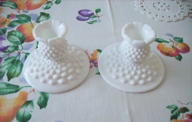 Pair Fenton White Milk Glass Hobnail Candleholders