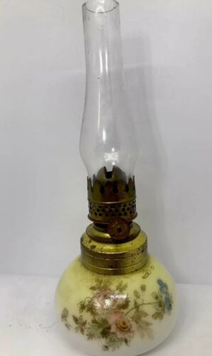 Title (ebay affiliate link): Antique Miniature Oil Lamp Milk Glass Hand Painted Victorian Roses Nutmeg Burner