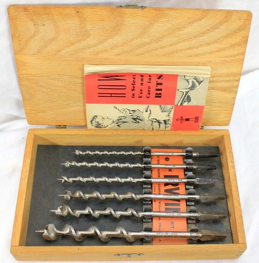 Vintage IRWIN Auger Drill Bit 6-Piece Set in Wood Box w/Booklet