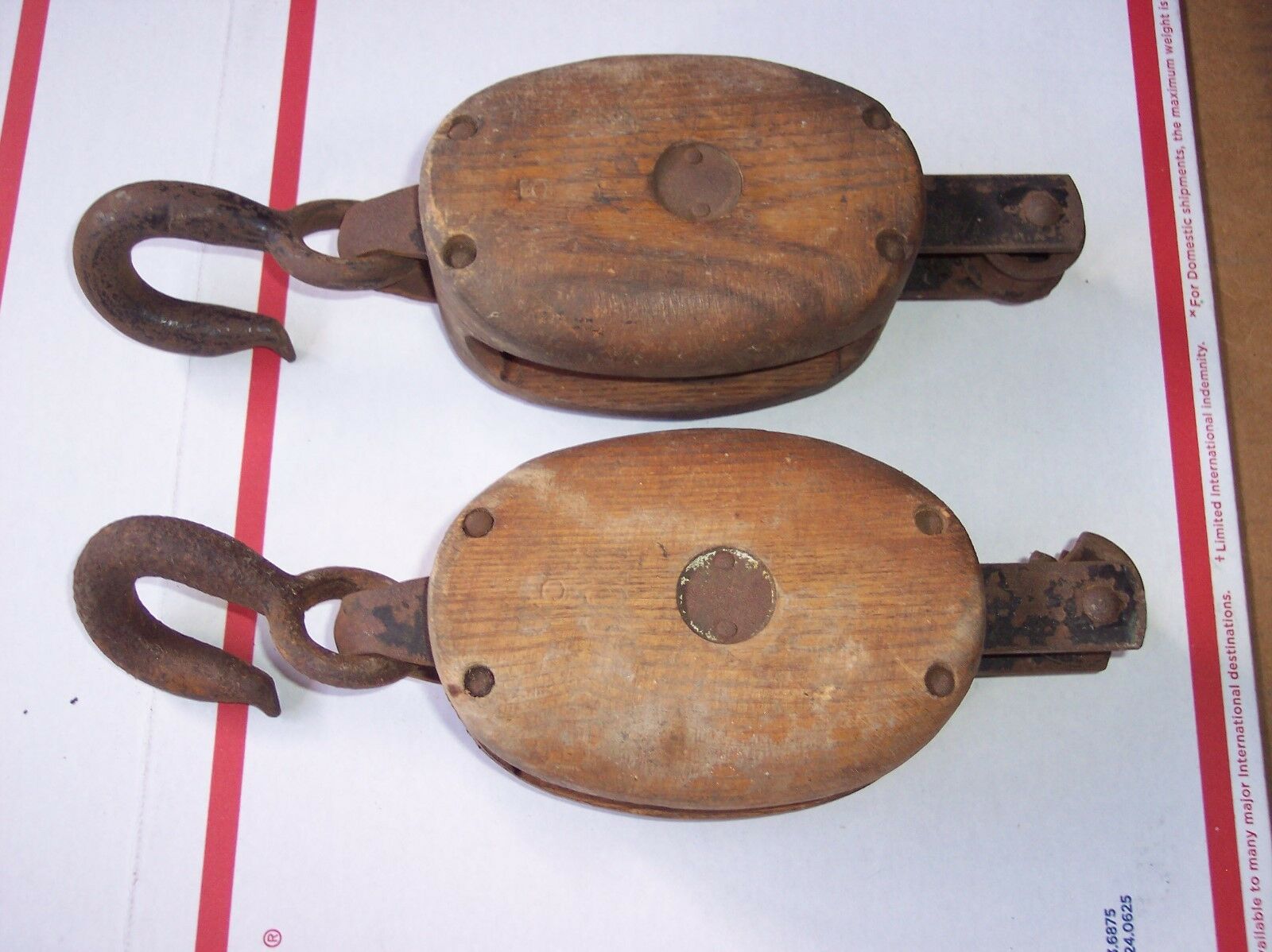 Title (ebay affiliate link): 2 VTG ANTIQUE OLD 5 WOOD BLOCK TACKLE PULLEY FARM BARN SHIP BOAT NAUTICAL TOOL