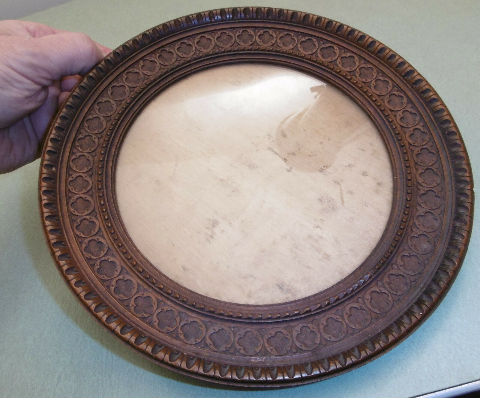 Antique Chip Carved Wood Round 9 3/8" Wooden Painting Frame With Glass