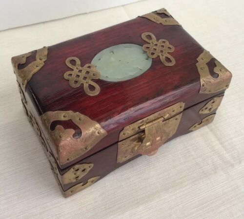 Vintage Chinese Wooden Brass Carved White Jade Trinket Jewelry Box
