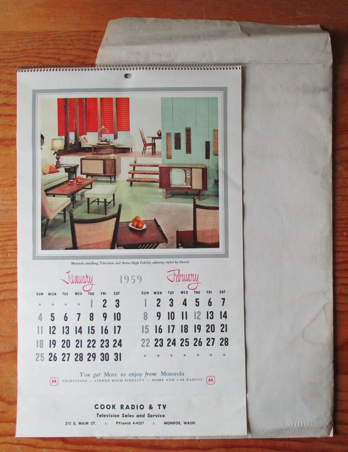 Cook Radio & TV Company Advertising Calendar 1959 Monroe WA Great Shape Envelope