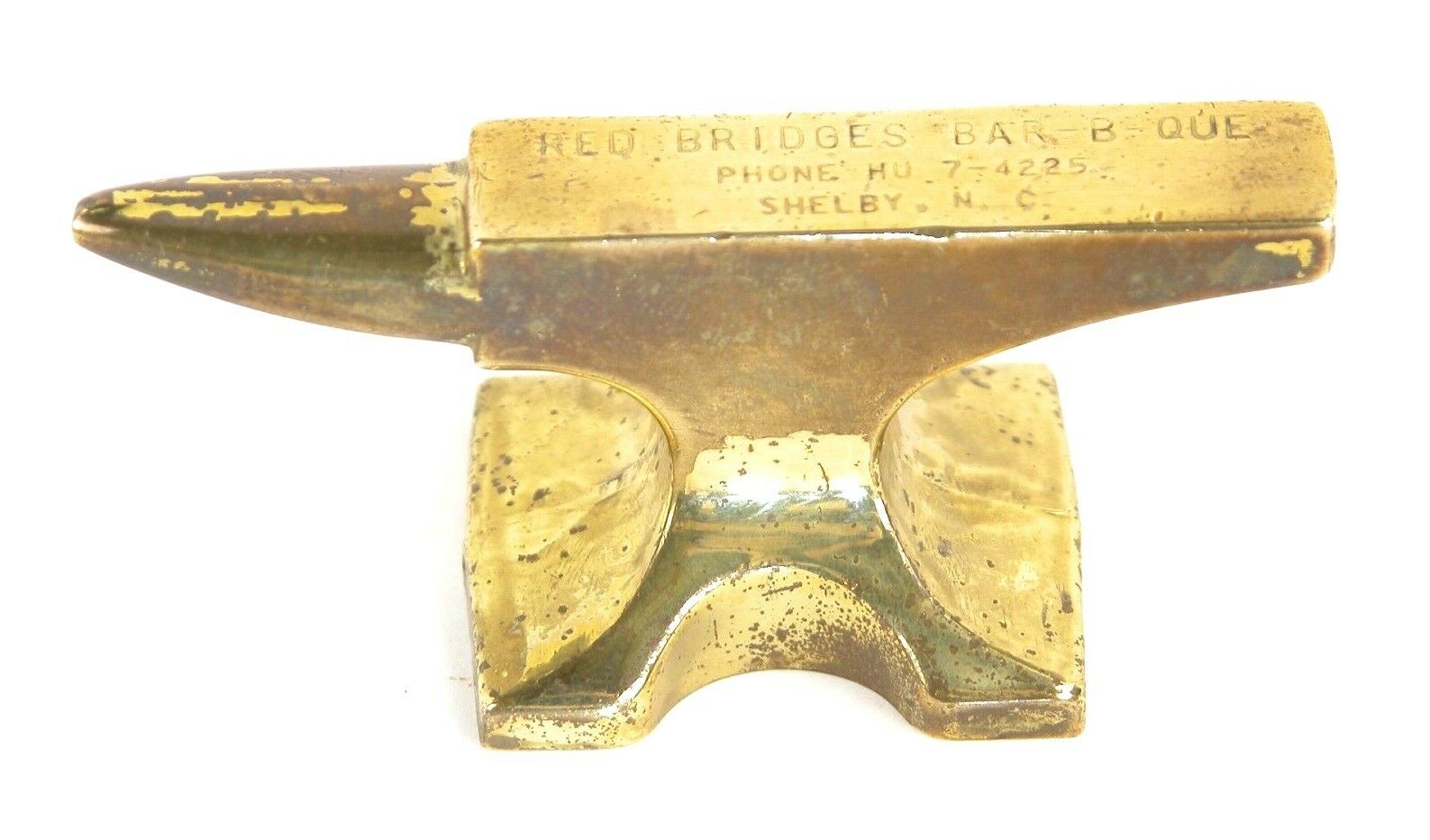 Title (ebay affiliate link): Vintage Mini Polished Brass Advertisement Anvil Red Bridges BBQ NC