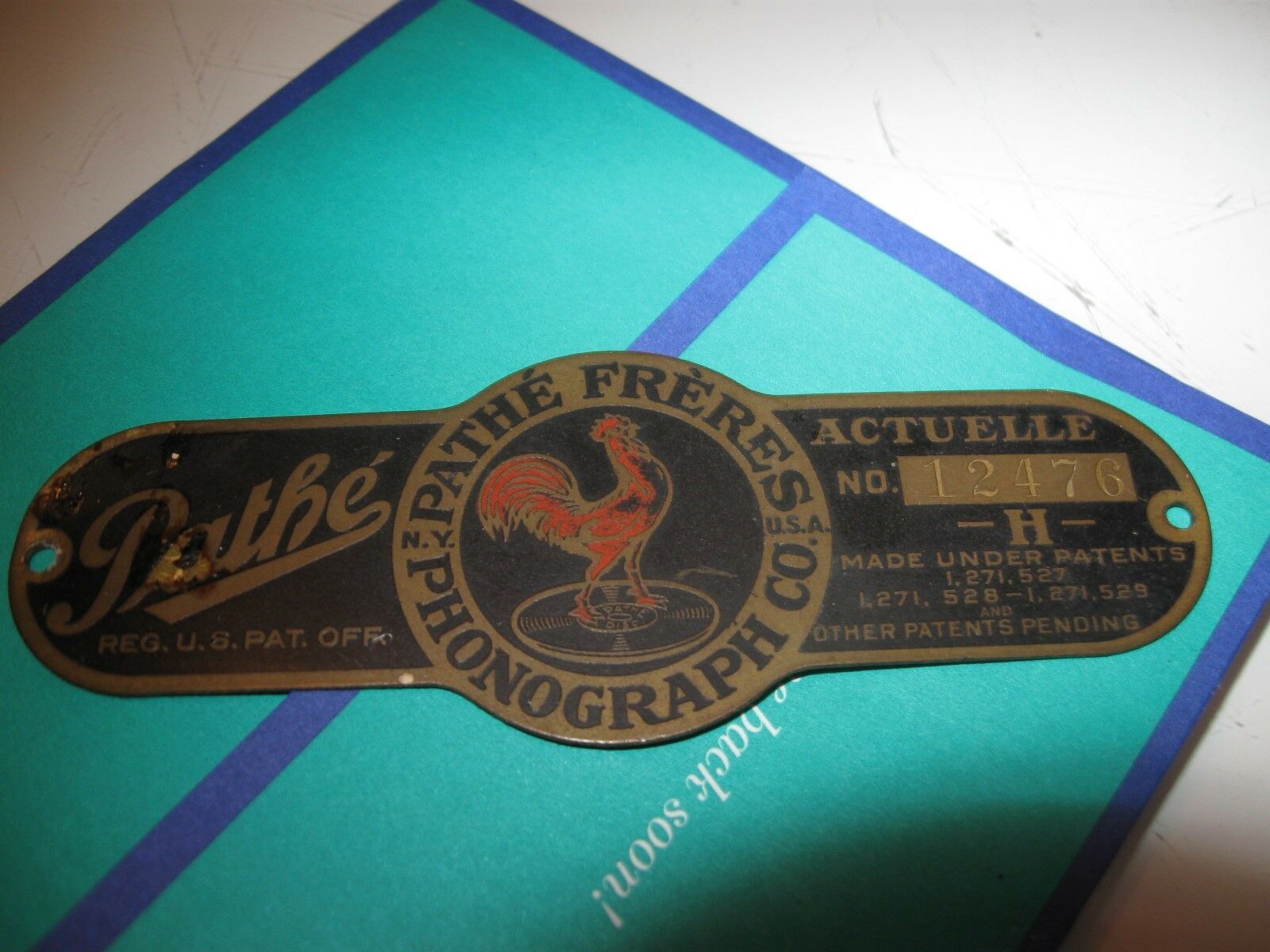 Title (ebay affiliate link): Pathe Freres very old Phonograph Co brass name plate Red Rooster
