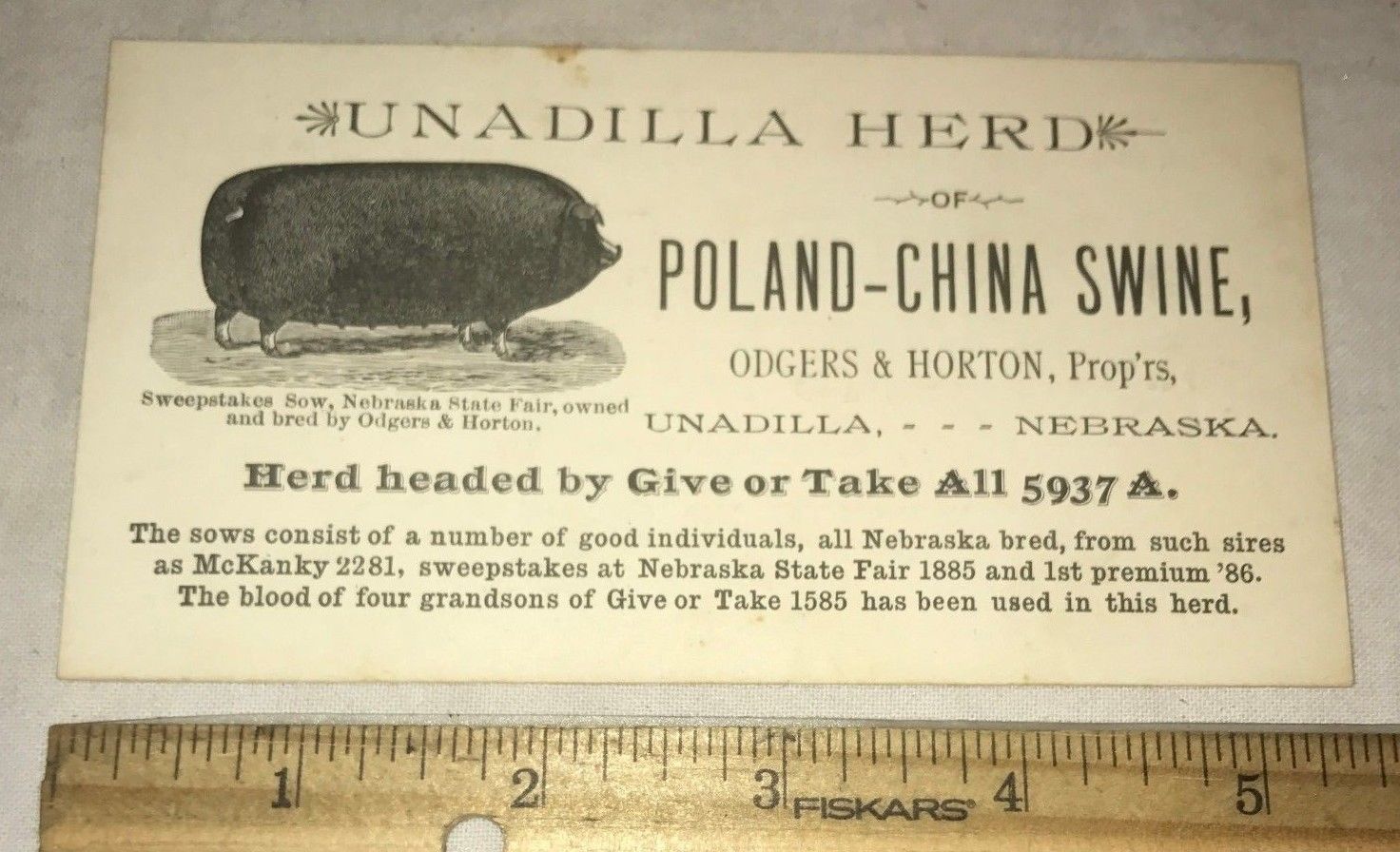 ANTIQUE FARM CALLING BUSINESS CARD UNADILLA POLAND CHINA SWINE PIG HERD NEBRASKA