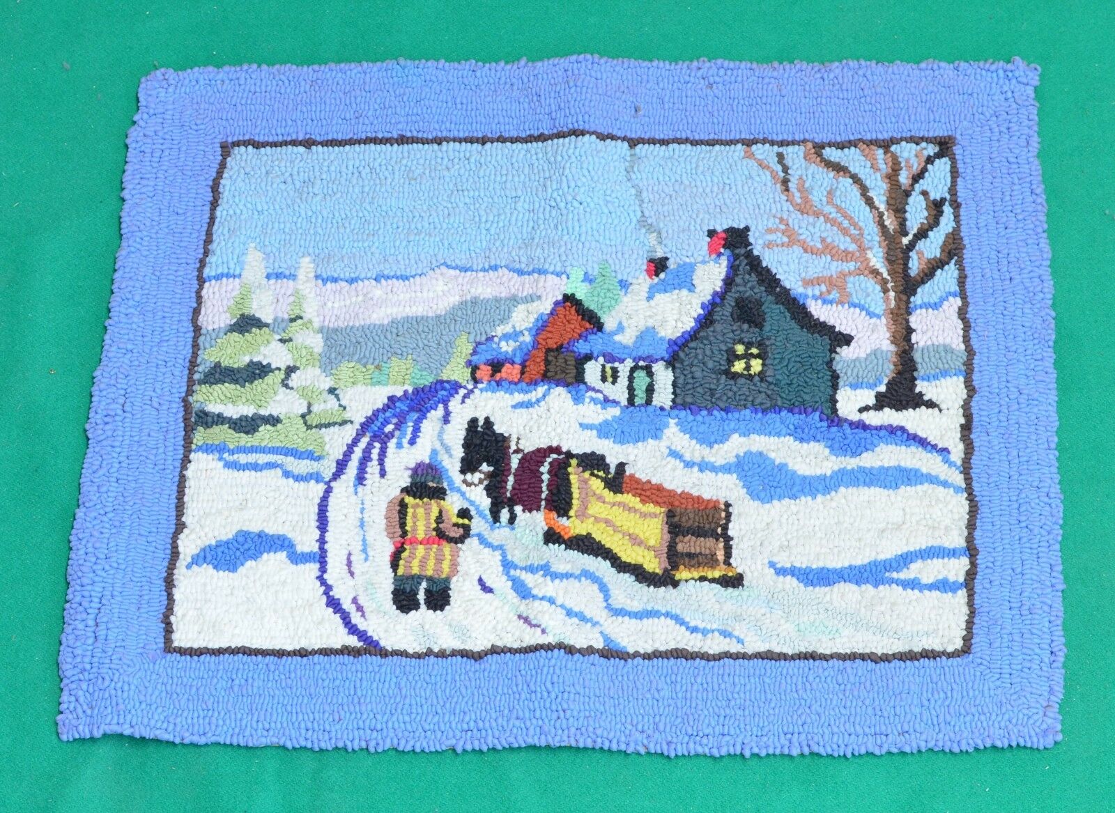 Title (ebay affiliate link): WINTER - Folk Art Hooked Throw Rug Hand Made Primitive Country Cottage- Antique