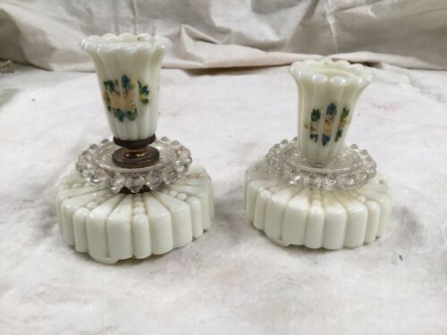 Vintage Uranium Milk Glass Candle Holders Yellow Green Flower Brass Accent RARE
