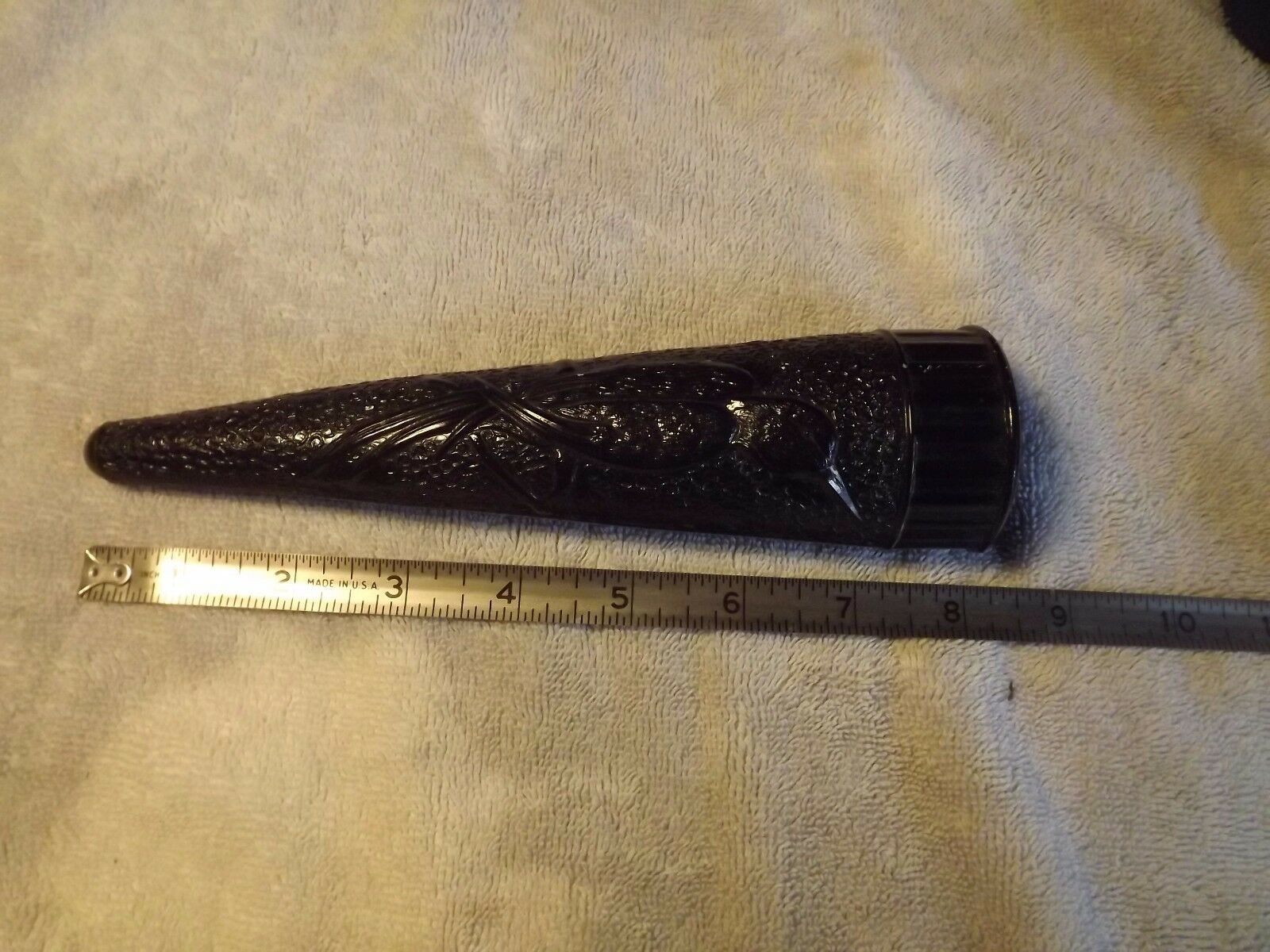 Title (ebay affiliate link): Black Depression Glass 8.5" Wall Pocket Vase w/ Embossed Bird Image
