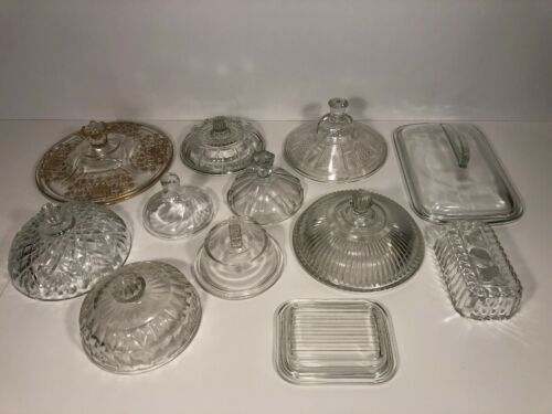 Title (ebay affiliate link): LOT OF 12 DEPRESSION GLASS DOME LIDS BUTTER LIDS APPROX. 3.5" - 7.5"
