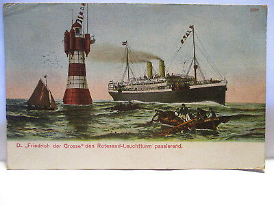 1908 GERMAN POSTCARD FREDRICH THE GREAT PASSING ROTESAND LIGHTHOUSE,SHIP