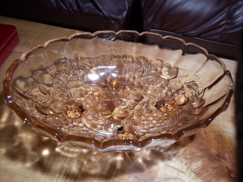 Title (ebay affiliate link): 4 Footed Pink Glass Depression Fruit Bowl Scallopped Edges Grape Pattern