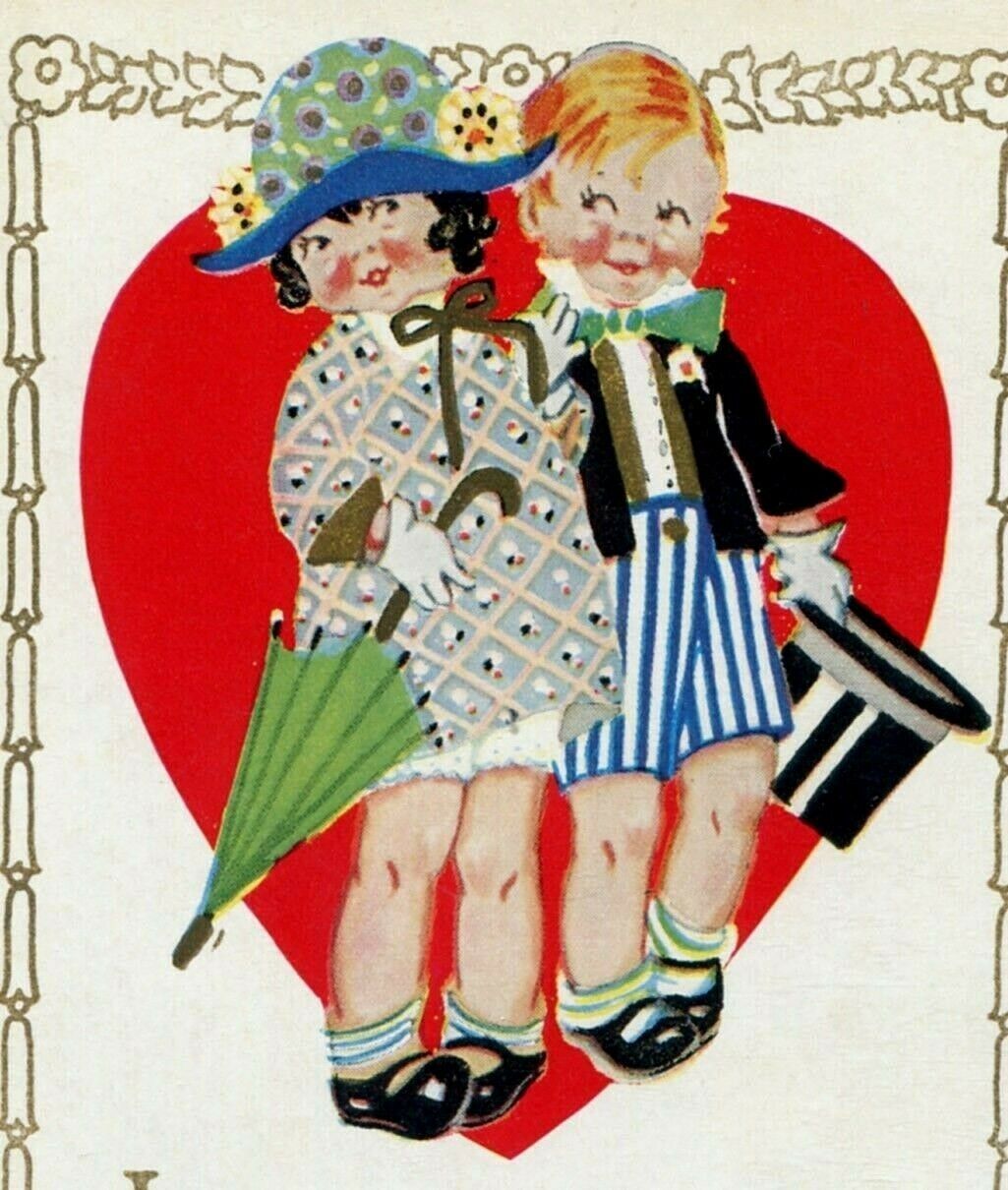 Dear Children~Boy in Top Hat, Girl in Cloche~Vintage ART DECO Valentine Postcard