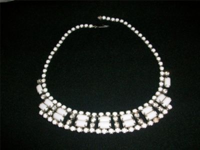 Vintage Milk Glass &Rhinestone Necklace~15"~Striking