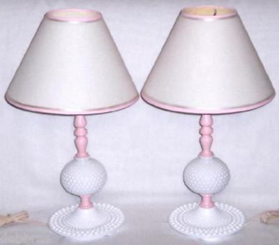 2 Two PINK Bedroom BUDOIR Lamps MILK Glass HOBNAIL 50's