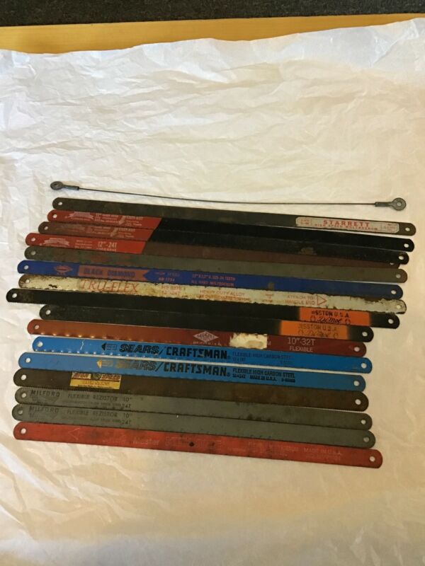 Title (ebay affiliate link): 16 vintage Hacksaw blades Milford Simonds Starrett Disston Milspec Craftsman