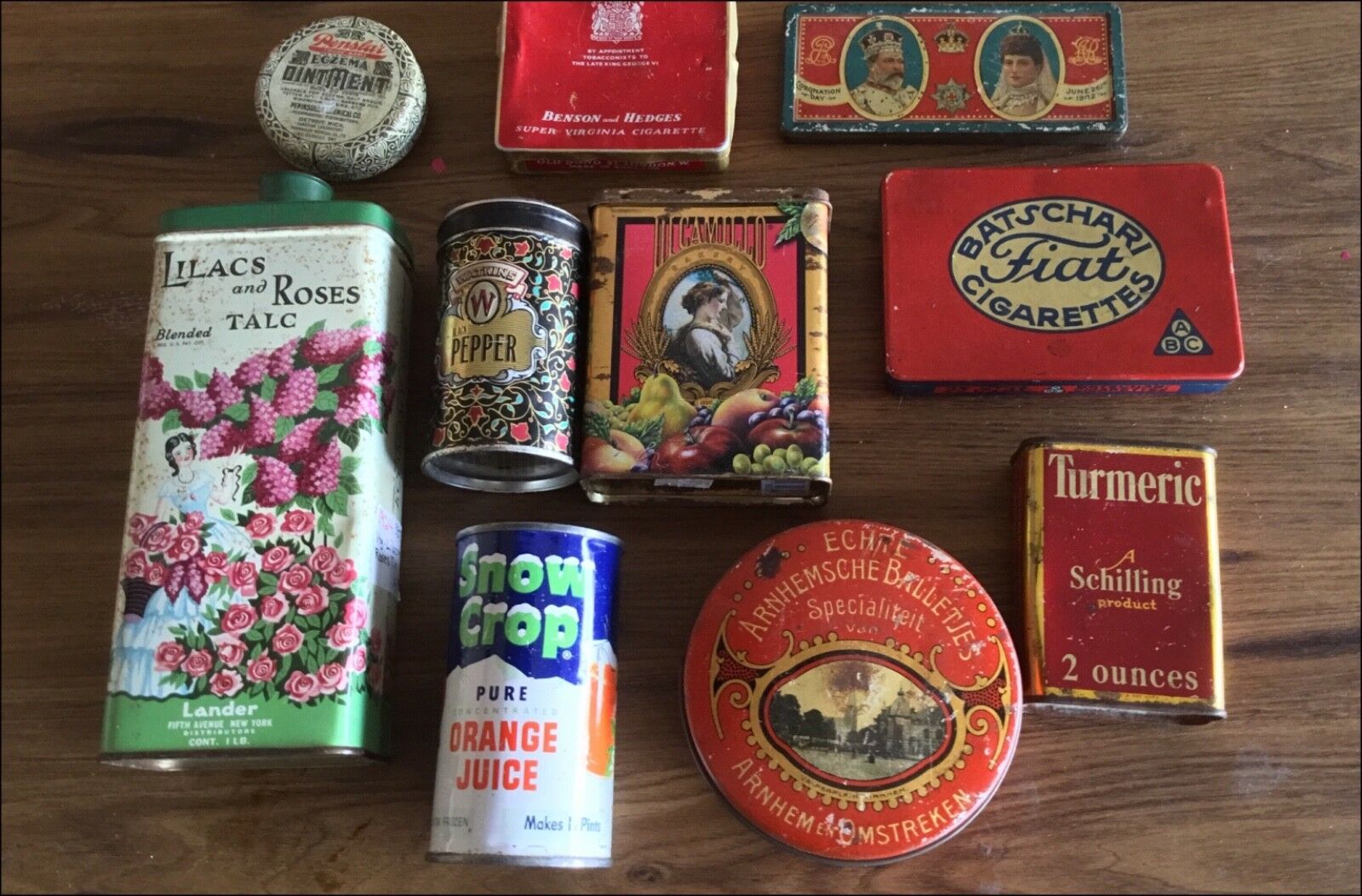 Lot of old antique vintage advertising tins mixe.. Wow!