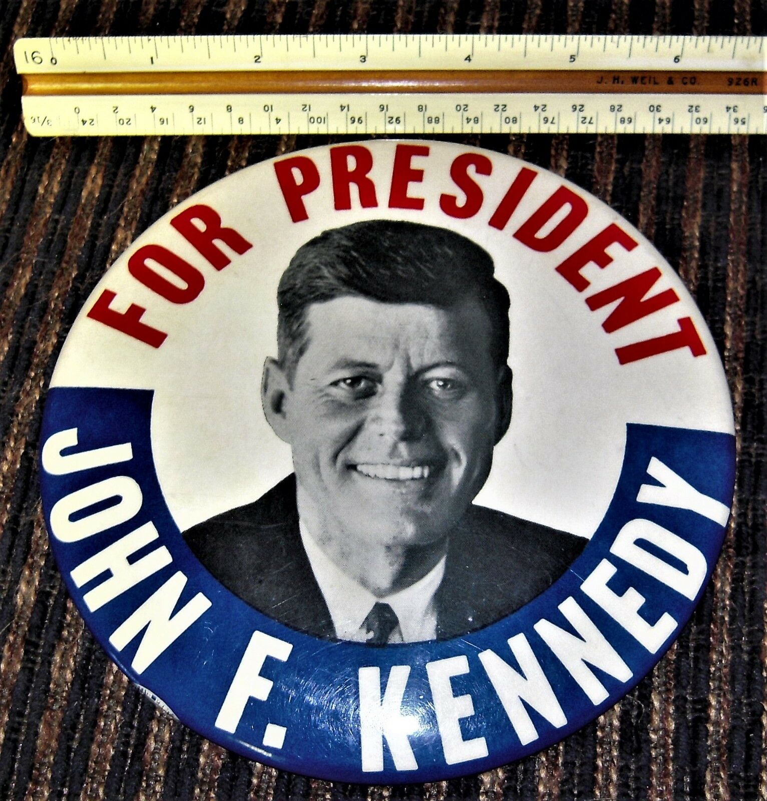 Title (ebay affiliate link): 1960 JFK campaign pinback button 6" wide JOHN F. KENNEDY