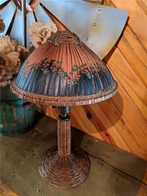 ANTIQUE WICKER LAMP AND SHADE HAND PAINTED BOHO VINTAGE BOMBAY SO UNIQUE! WORKS!