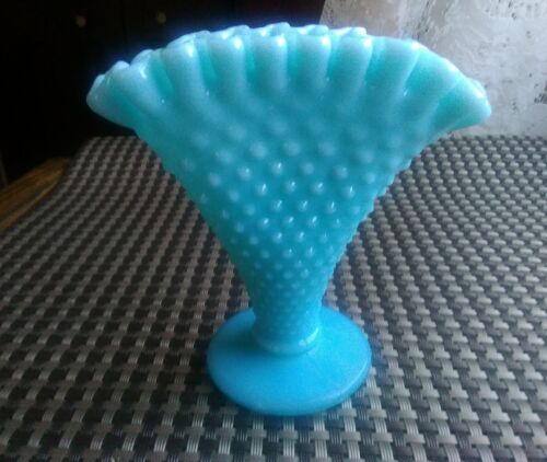 FENTON TURQUOISE PASTEL HOBNAIL MILK GLASS FAN VASE