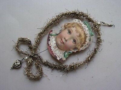 Title (ebay affiliate link): Antique PAPER BABY HEAD IN A TINSEL FRAME CHRISTMAS ORNAMENT