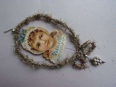 Title (ebay affiliate link): Antique PAPER GIRL HEAD IN A TINSEL FRAME CHRISTMAS ORNAMENT