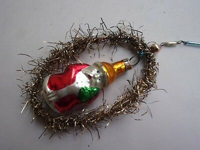 Antique BLOWN GLASS SANTA IN A TINSEL FRAME CHRISTMAS ORNAMENT