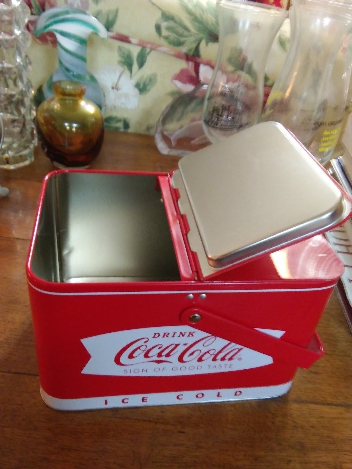 Title (ebay affiliate link): COCA-COLA SM METAL PICNIC BASKET/PLANTER/LUNCH BOX/SERVING PIECE 7 x 5 x 4.5" HI