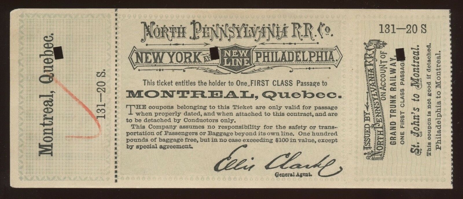 Title (ebay affiliate link): North Pennsylvania Railroad Co~Train Ticket~St. Johns to Montreal Quebec~1880s