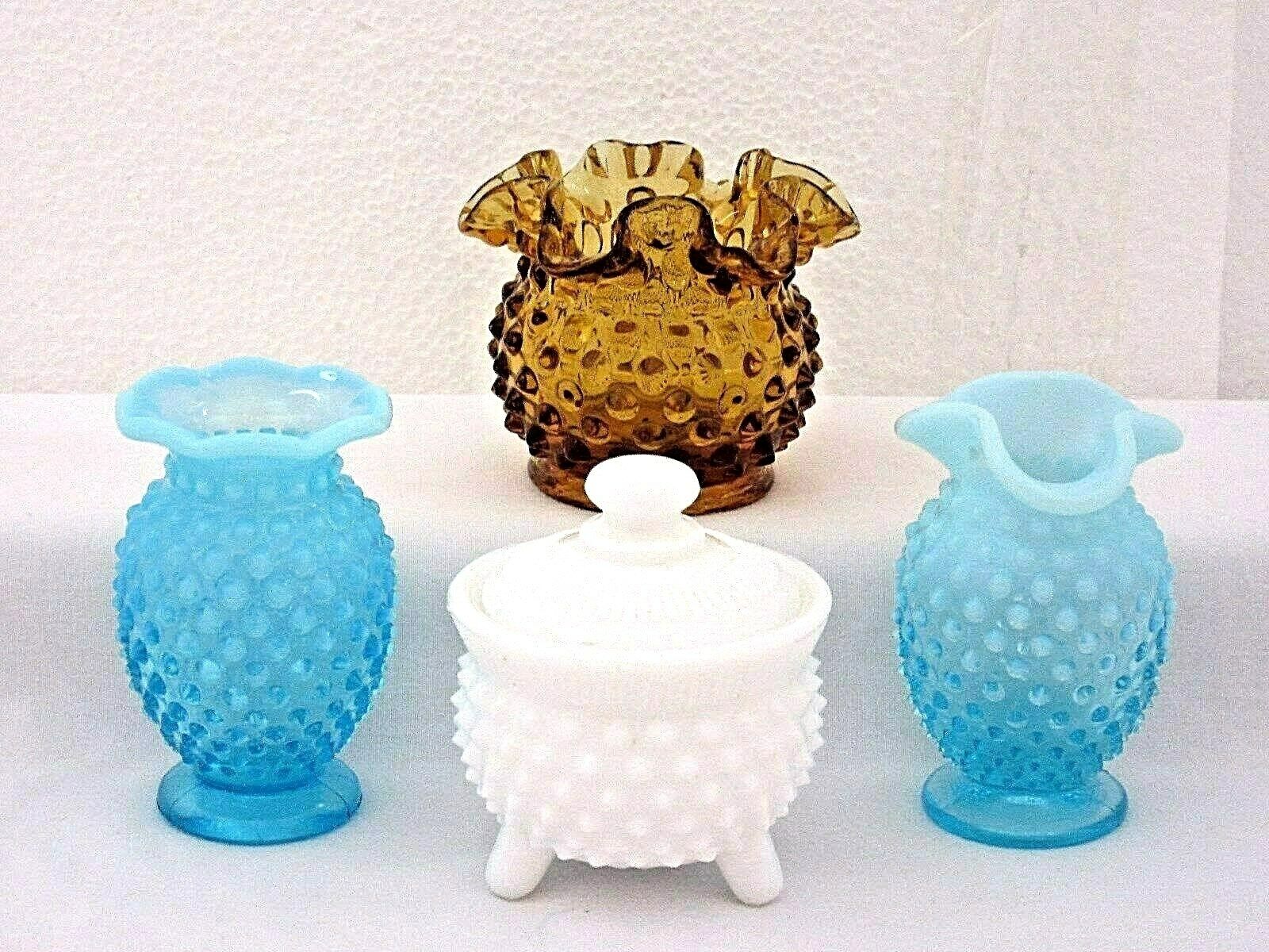 Title (ebay affiliate link): LOT FENTON HOBNAIL OPALESCENT BLUE VASE AMBER ROSE BOWL MILK GLASS CONDIMENT