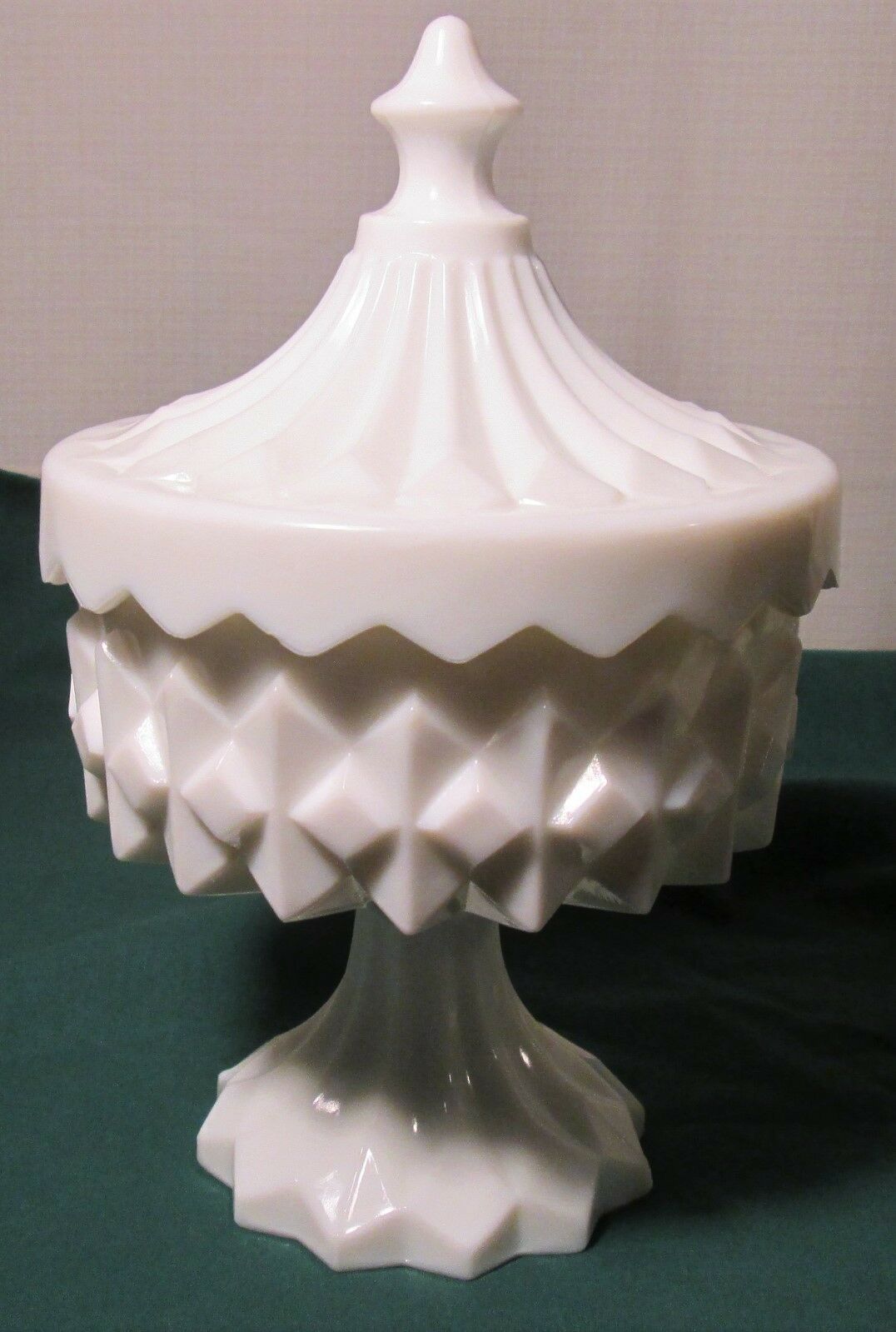 Title (ebay affiliate link): WESTMORELAND Glass-Vintage White Milk Glass Covered Candy-Diamond Point/Sawtooth