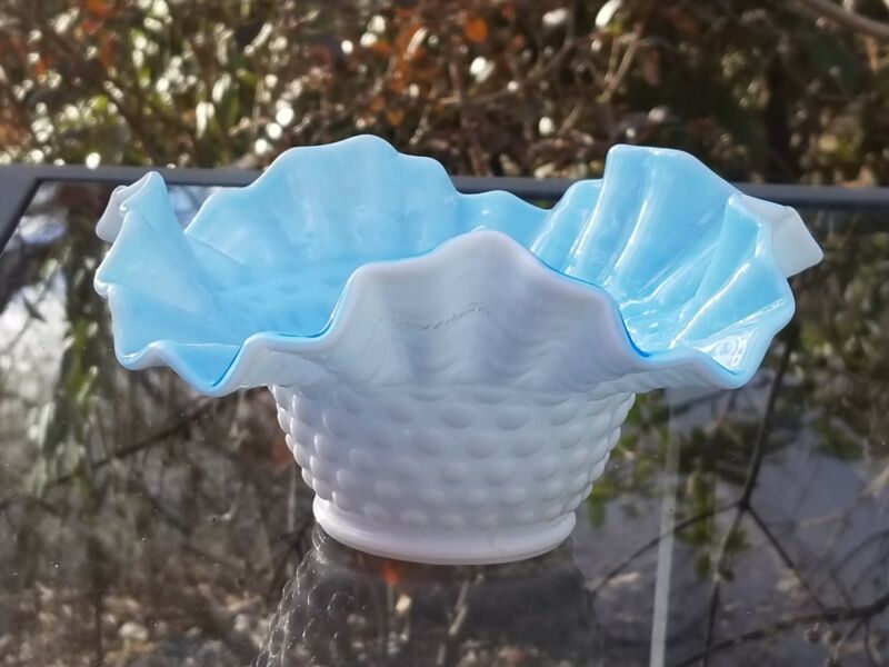 Title (ebay affiliate link): Fenton Milk Glass Hobnail Ruffled Edge Bowl. White exterior, powder blue inside.