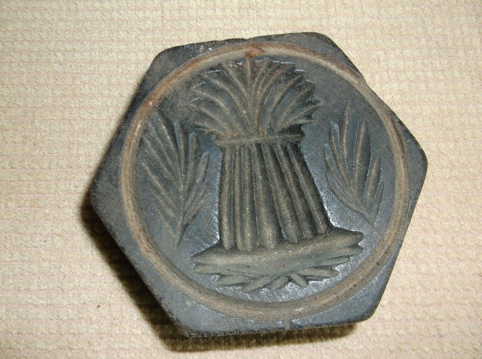 antique wooden butter stamp/press, wheat stalks, 6-sided, primitive, 3"
