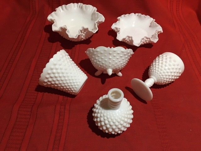 Title (ebay affiliate link): 6 Lot Various White Hobnail Milk Glass Ruffled Candy Dishes Compote