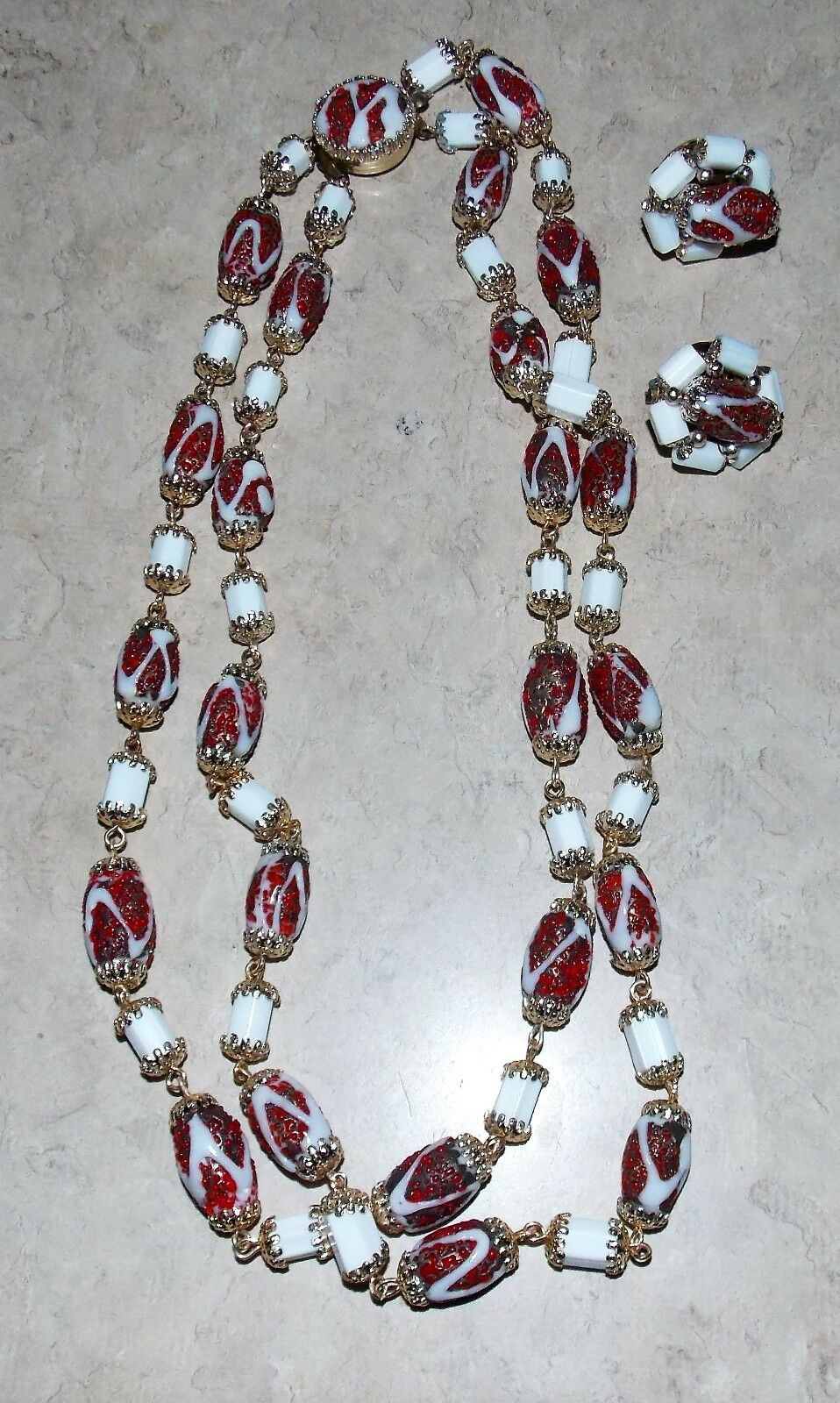 Vintage Japan White Milk Glass Red Handcrafted Bead Choker Necklace Earring Set