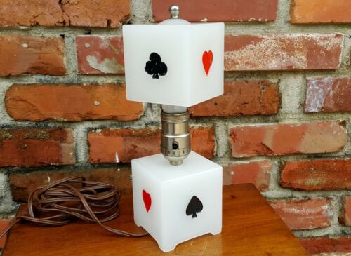 Old Vtg Bridge Poker Playing Card Dice Milk Glass Mid Century Modern Table Lamp
